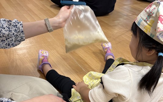 - 皆んな元気いっぱいに、袋をフリフリ、袋をモミモミしてくれました。「1人で頑張ってやったよ!」と見せてくれたり、成形の時は「積み木はこんな形もあるよ!」とたくさん教えてくれました。ご家庭でも楽しんでいただけたら、幸いです。