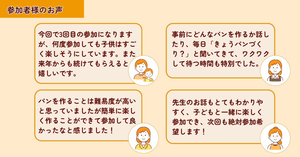 親子でパン生地を触りながら会話ができて、好きな形を作って焼いたパンを一緒に食べて、出張パン教室にはたくさんの楽しみが詰め込まれています。
