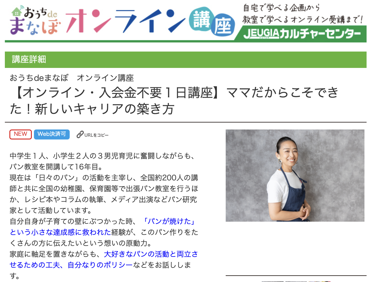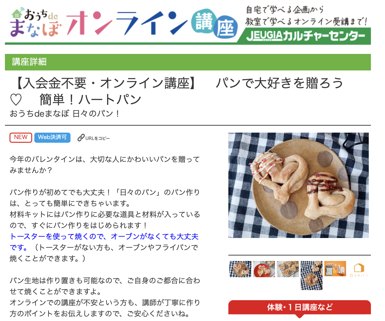 この度、JEUGIA様の入会金不要・オンライン講座【おうちdeまなぼ】に日々のパンが登場!2つの講座が現在お申し込み受付中です。