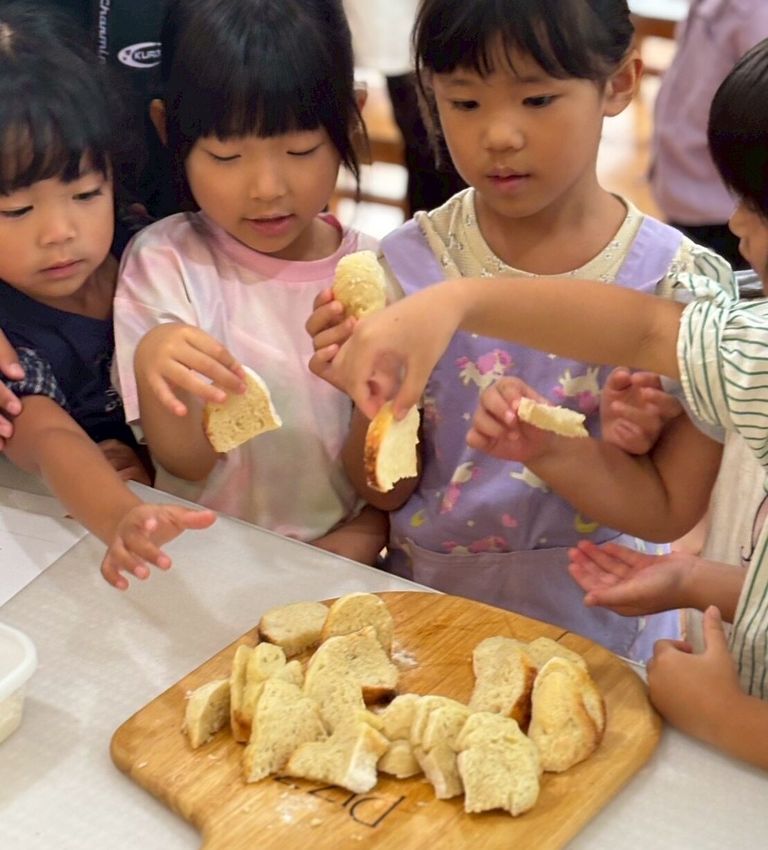 ▲園児親子や園の先生方へ。簡単パン作りなので、子供たちも率先して頑張っています。トースターの中でどんどん膨らむ様子や香ばしいかおりにワクワク。焼き立てをみんなで『美味しいね』と試食する雰囲気も最高!