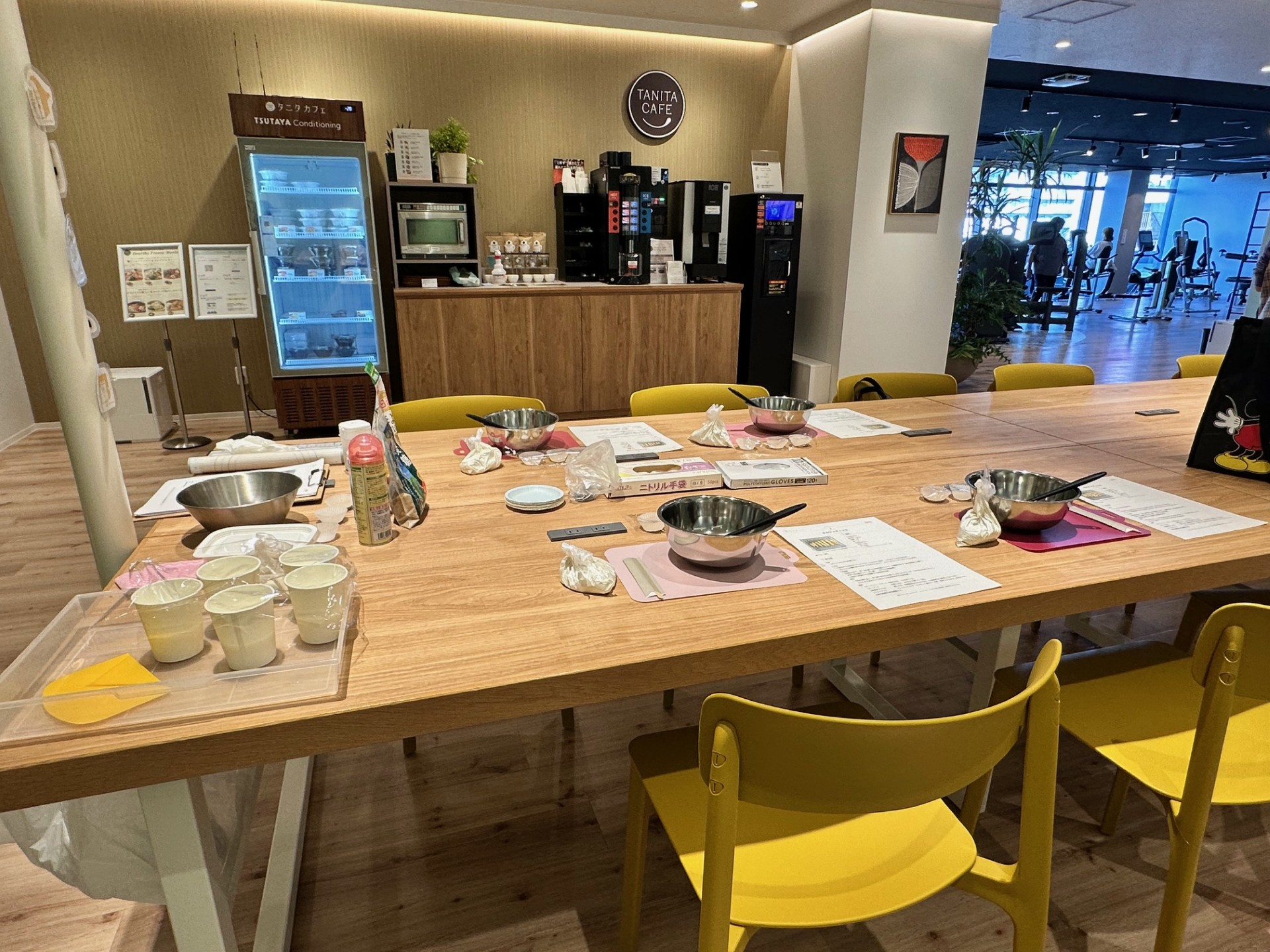 スポーツジム内のカフェスペースでレッスンをします。