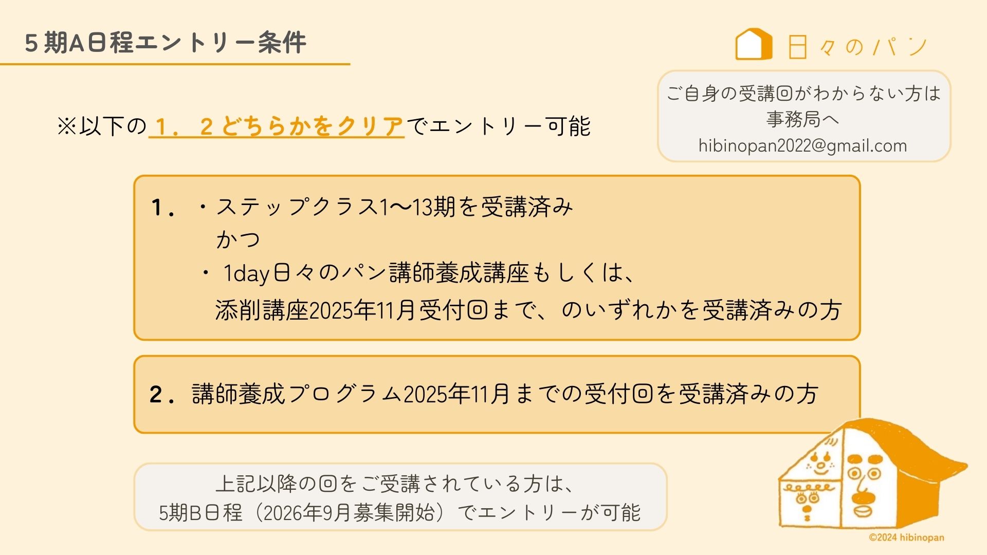 B日程にエントリーをご希望の方で、現在資格を満たしていない方は、講師養成プログラム、または2026年5月募集のステップクラスにお申し込みの上、受講をお済ませください。添削講座は毎月募集があり、5月までのお申し込みをエントリー資格といたします。