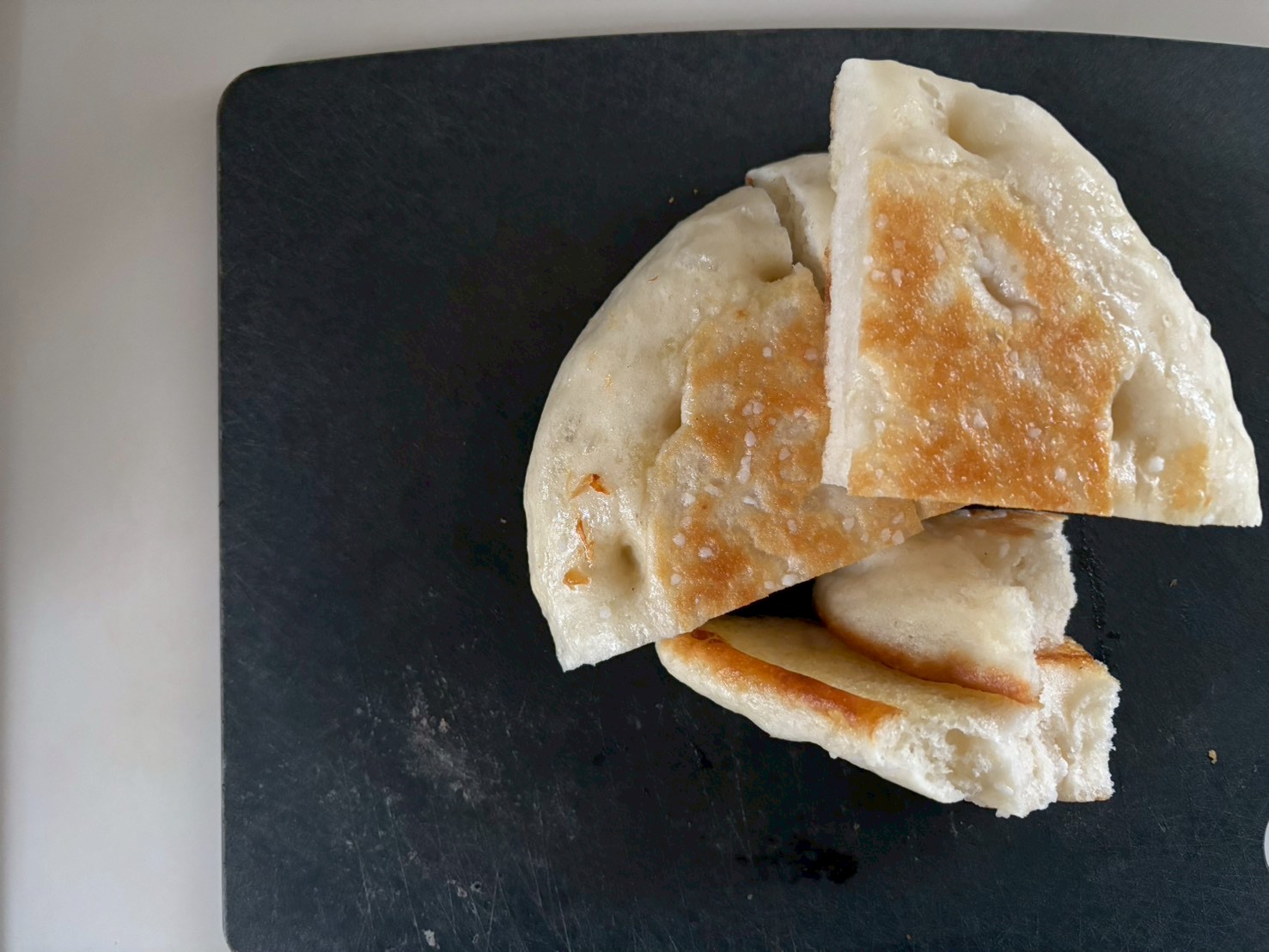 生地がふっくら膨らんだら、フライパンのそこに残っているオリーブオイルを指につけて生地に穴をあける。お好みで岩塩・ハーブを適量かける。