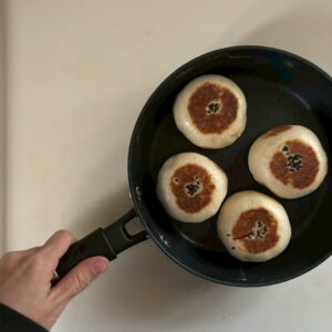 フタをして15分程休ませる。この時、フライパンが冷たいようであれば少し温めてあげると〇(生地に火が通らないように注意。フライパンをあたためるだけ)